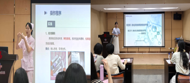 活動(dòng)伊始,我院護(hù)理部主任高云教授致開場詞,點(diǎn)明此次集體備課對新教師成長及院校合作的重要意義。隨后進(jìn)入試講環(huán)節(jié),鄭燕云、李文容等六位新教師圍繞基礎(chǔ)護(hù)理及內(nèi)科護(hù)理領(lǐng)域依次登臺展示,每位教師10分鐘的課堂呈現(xiàn)亮點(diǎn)頻出。李文容老師在《標(biāo)本采集--靜脈采血》教學(xué)中,以模擬患者為對象,完整規(guī)范地演示操作流程;林麗芬老師則別出心裁,用動(dòng)畫RAP說唱形式總結(jié)消化性潰瘍疾病知識要點(diǎn),將現(xiàn)場氣氛推向高潮。不同的授課風(fēng)格充分彰顯了機(jī)關(guān)醫(yī)院護(hù)理教師團(tuán)隊(duì)扎實(shí)的專業(yè)素養(yǎng)與卓越的教學(xué)能力。